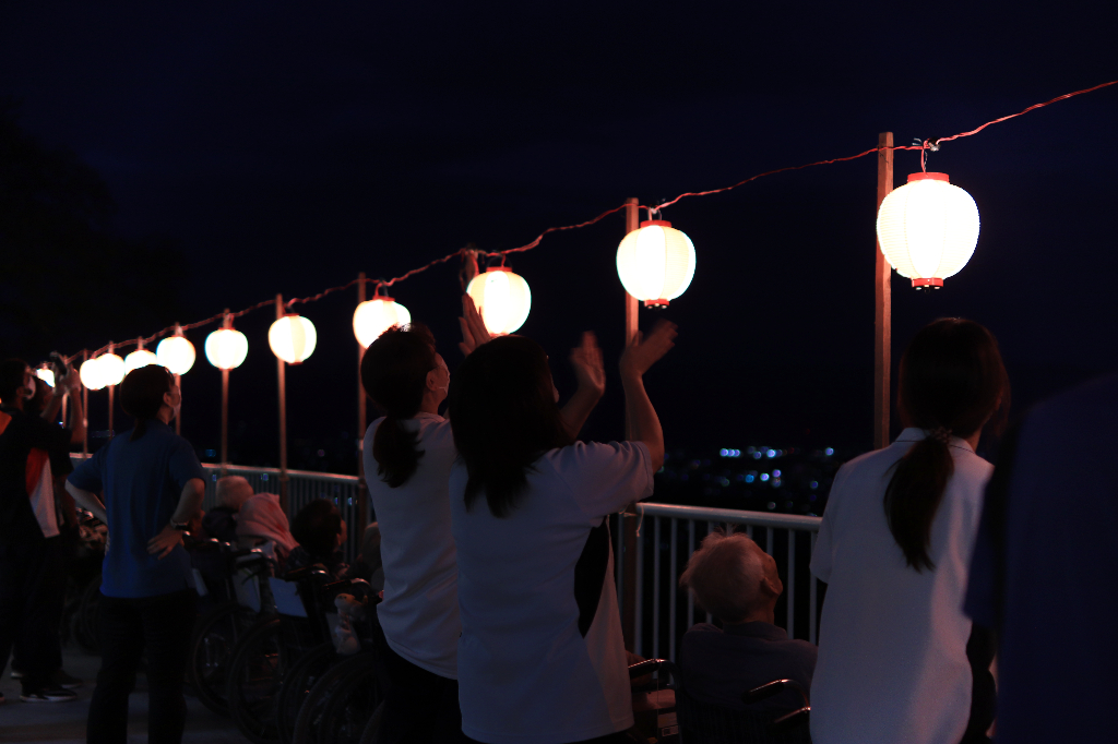 当日は提灯の明かりが灯る中で屋台風のおやつやジュースを楽しんだ後、職員と利用者合同での盆踊り大会を開催し大いに盛り上がりました。